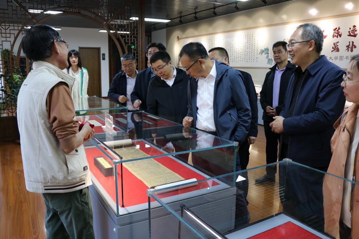 苗福生介绍了图书馆的基本情况,季祥一行先后走进图书馆古籍特藏库、古文献保护展示中心与智能书库,实地察看古籍善本保存环境及展陈情况,详细了解了我校图书馆在古籍保护传承、数字化利用等方面的工作举措与实践成效,并体验了智能书库便捷的图书借阅流程。